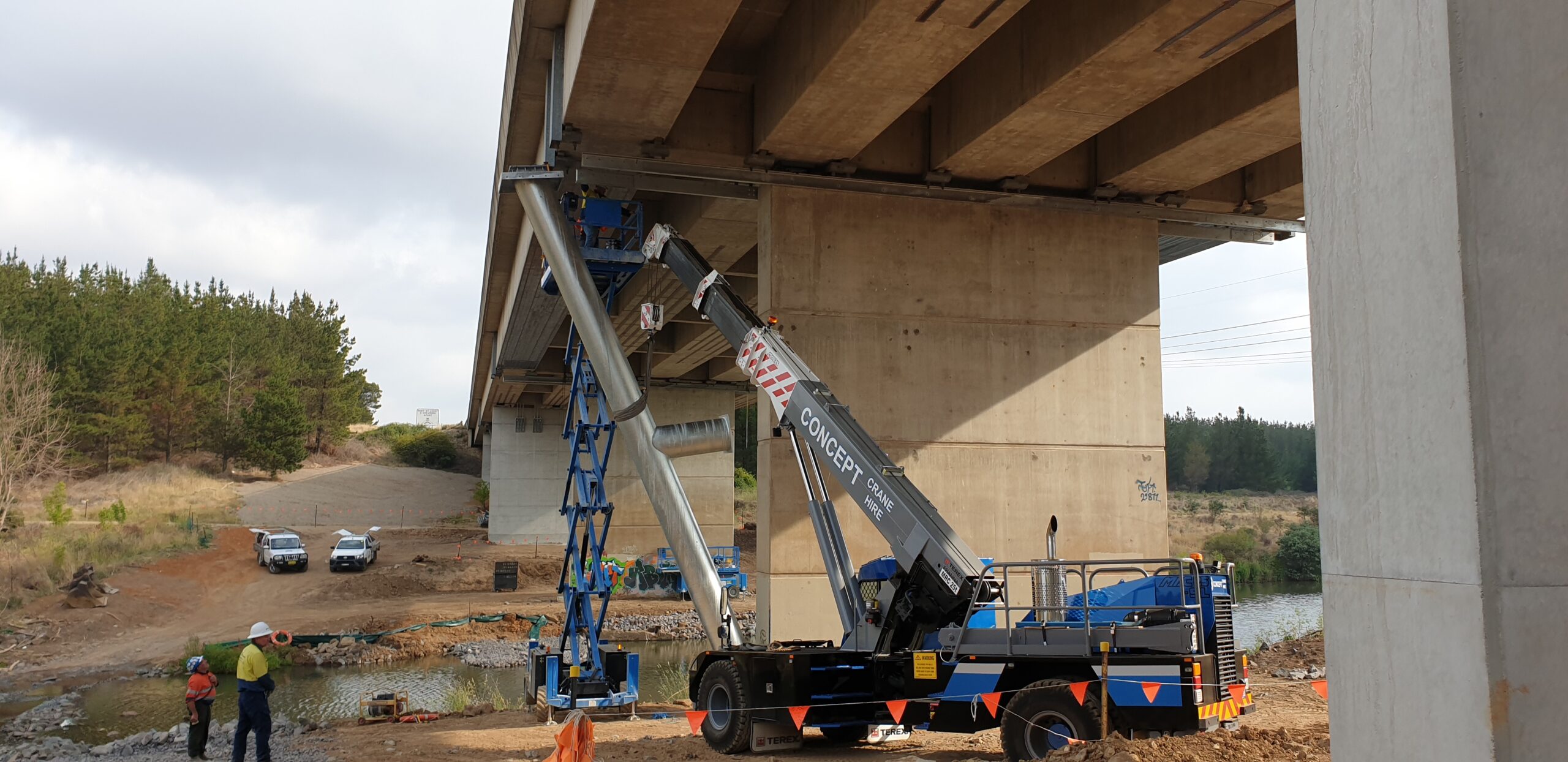 Access for installation below the bridge deck was challenging. The new supporting steelwork weighed in excess of 8.0 tonnes per pier with individual members measuring over 15 metres long and approximately 3.0 tonnes each. These members were transported to the construction site using a 25T Franna crane and carried across the river via a temporary river crossing. Our rigging team worked closely with the crane crew to manoeuvre the members into position – all from the underside of the bridge.